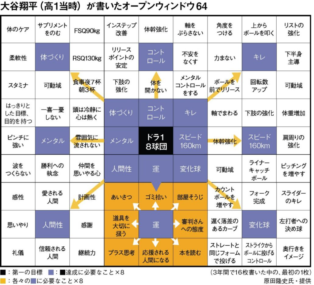 メジャーリーグで前人未到の活躍を続ける大谷翔平選手。彼が高校生の時に、目標を達成するために書いていた「マンダラート(目標達成シート)」の話は有名です。