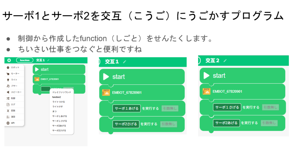 サーボモーターとembotに接続する位置を写真で示した